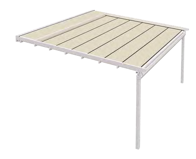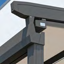 Hochpräzise Zahnriementechnik sorgt für gleichmäßiges Ein- und Ausfahren und die Spannung der Tuchabschnitte. Regenwasser wird über die Tuchfl he, die Regenrinne und unsichtbar durch das Innere der Pfosten abgeleitet.
