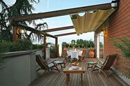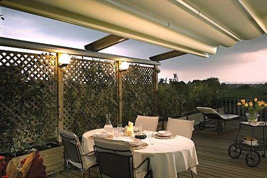 Dieses System ist an einer tragenden Wand zu befestigen und besteht aus einer Holzstruktur und einer Markise mit Faltverschluß.