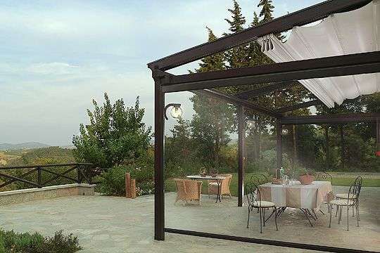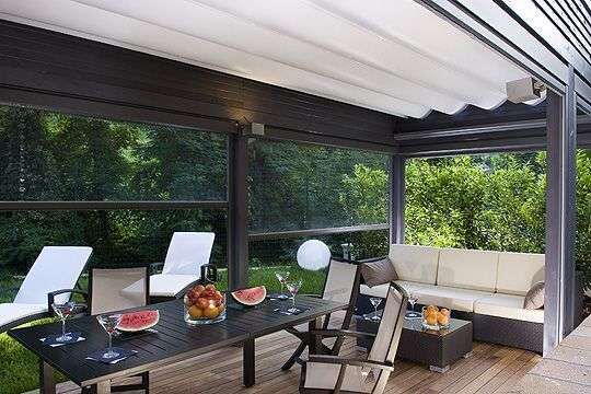 PT45 ist ein auf Maß gefertigtes, bewegliches Abdeckungssystem für den Sonnen- und Regenschutz.
