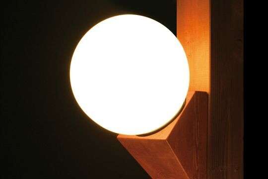 Lampen mit Halterungen aus Lamellenholz, im Druckkessel imprägniert, in den Musterfarben erhältlich. Kugel aus Acrylglas, rauch- oder opalfarben. Ohne Leuchtkörper.