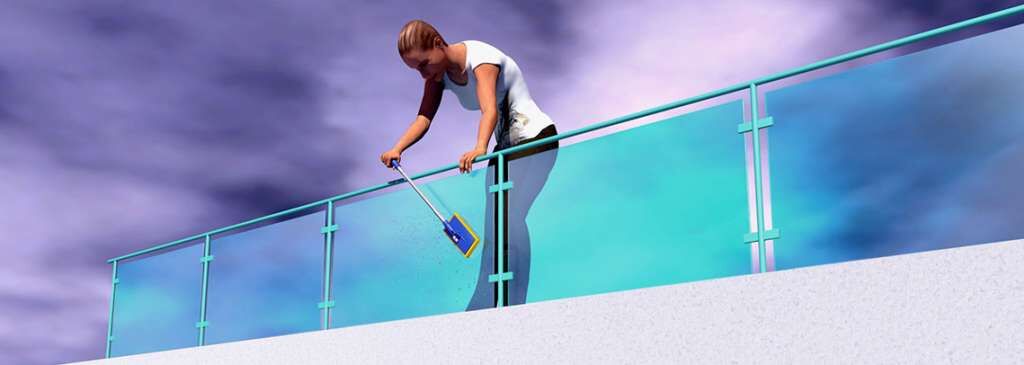 Reinigungsschwämme sind speziell auf Terrassenüberdachungen angepasst und ermöglichen die Reinigung der sonst so schwer zu erreichenden Kanten zwischen Profil und Glas. Mit einem speziellen Gelenkaufsatz lässt sich auch beim Abziehen des Wassers ein gleichbleibender Winkel erreichen durch den das Glas sauber und Schlieren frei gereinigt werden kann.